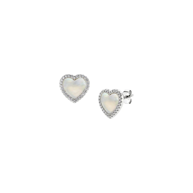 Orecchini a lobo in argento 925 rodiato a forma di cuore con madreperla centrale e bordo di zirconi bianchi. Chiusura a farfallina. Dimensioni 7 x 7 mm.